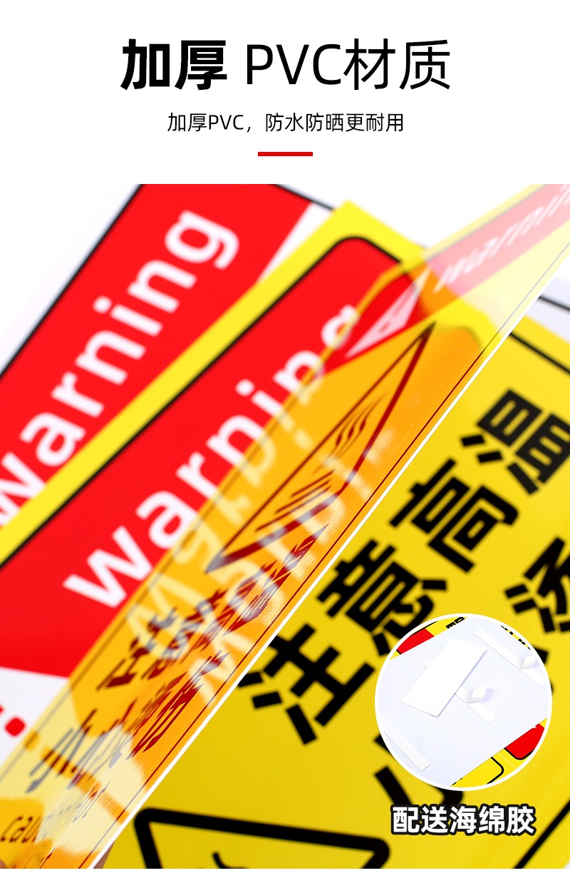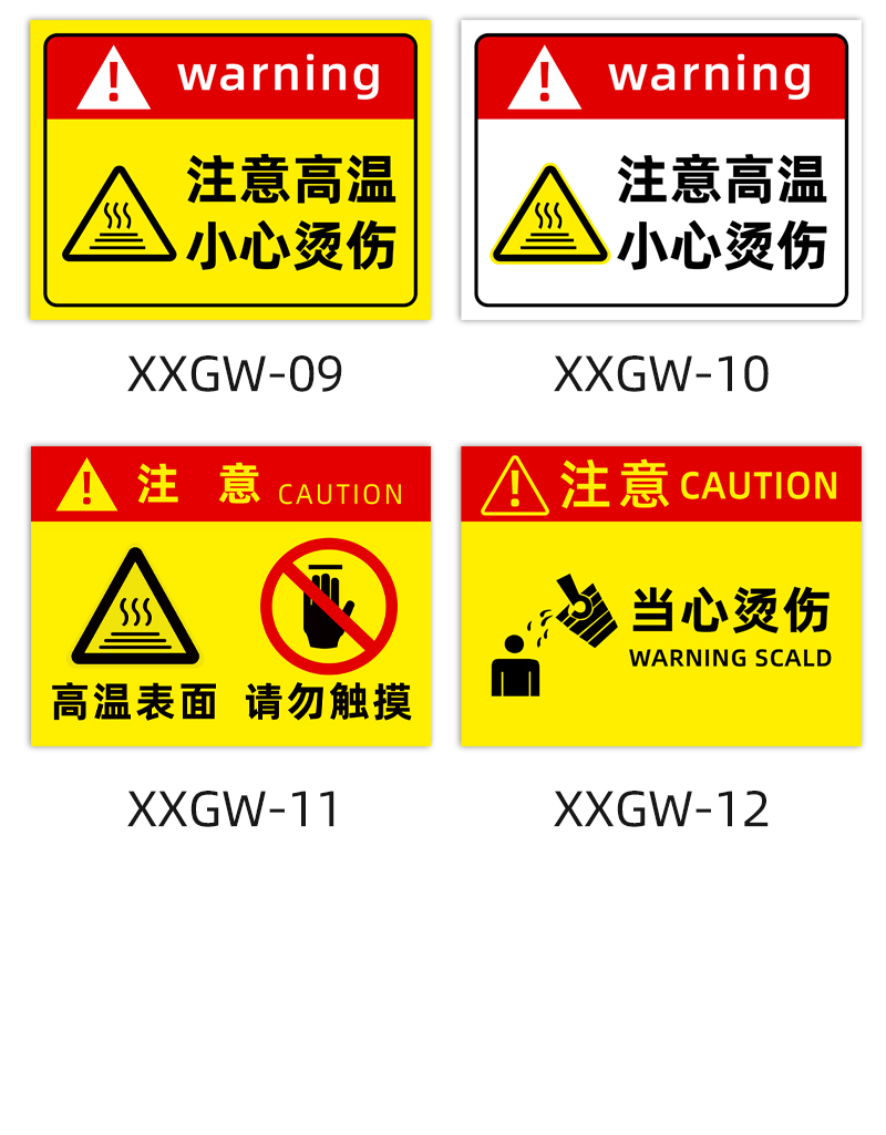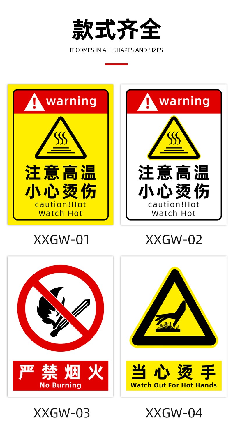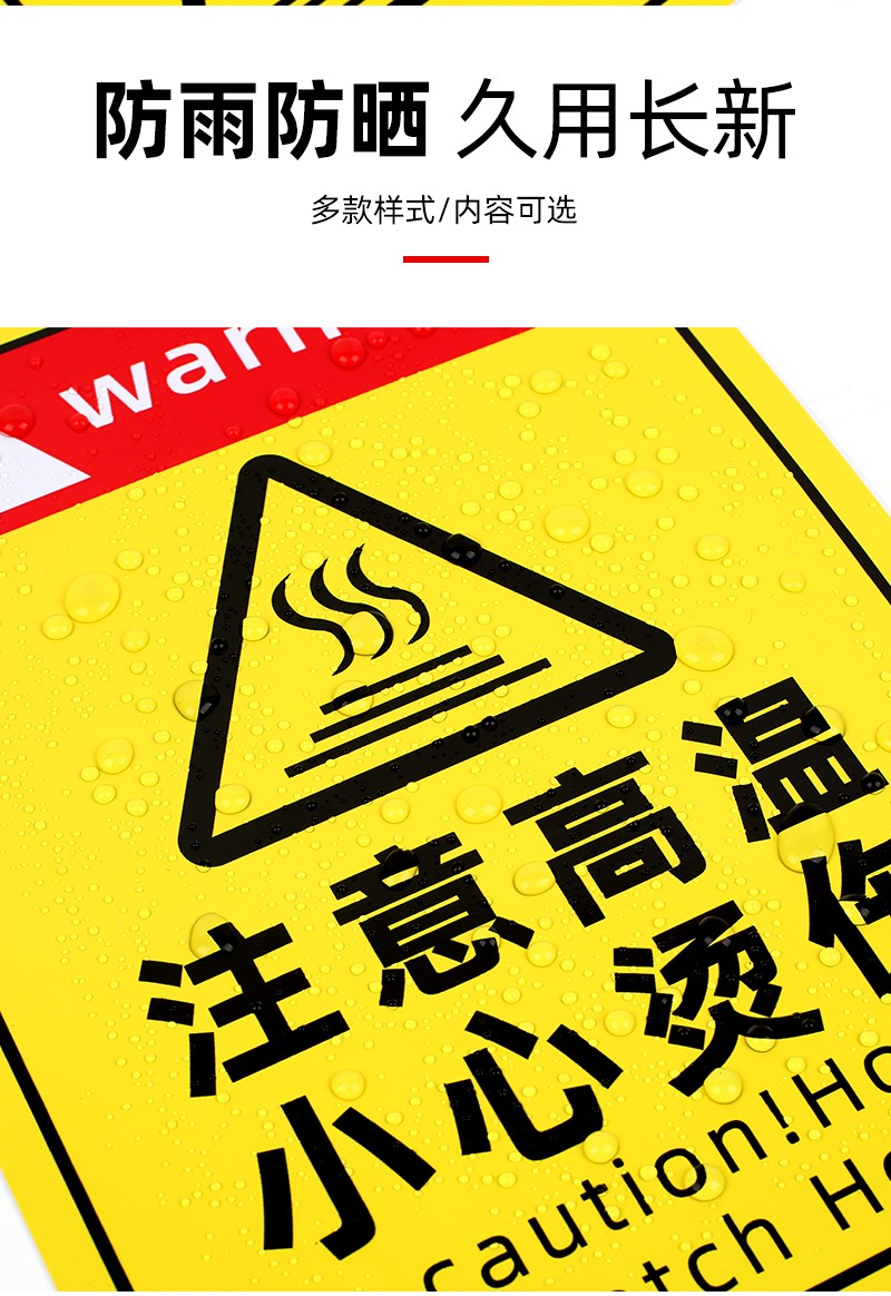 “注意高溫提示貼”“小心燙傷警示標志”“防燙傷標識”均采用優質 PVC 材料制作,結實耐用。這些標識設計醒目,文字清晰,圖案直觀,能夠快速有效地傳達安全信息。自帶背膠,粘貼簡單牢固,可廣泛應用于廚房、工廠、實驗室等存在高溫燙傷風險的場所,時刻提醒人們注意高溫危險,防止燙傷事故發生,為您的工作和生活環境打造可靠的安全防線。